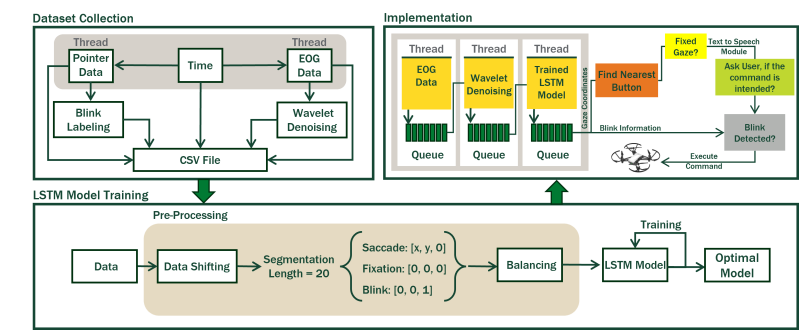 Taking the sequential nature of EOG data into account guides us to employ a Long Short-Term Memory (LSTM) model. We train this model to convert sequences of EOG signals into screen coordinates, effectively mapping eye movements to specific pixels on the monitor. The first essential step in this approach is collecting dataset of EOG signals for the LSTM model's training. Once the dataset of EOG signals is collected, the next step is training the LSTM model with this data. After training, the model is ready for deployment in our application, where it interprets eye movements in real-time to control the GUI, seamlessly translating gaze into precise commands for interaction.